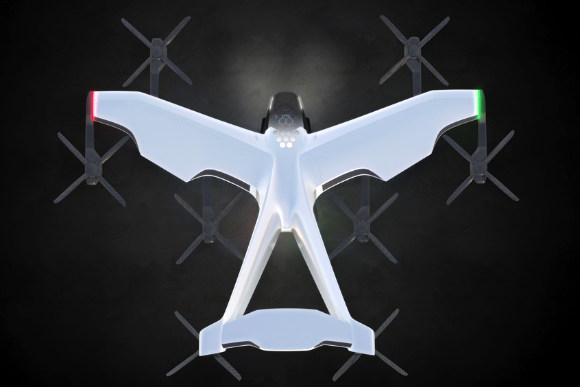 eVTOL aircraft demonstrator. An unmanned 4-seater urban air taxi. Includes the latest variant, CityAirbus NextGen with fixed wings, V-shaped tail, and eight electrically powered propellers.