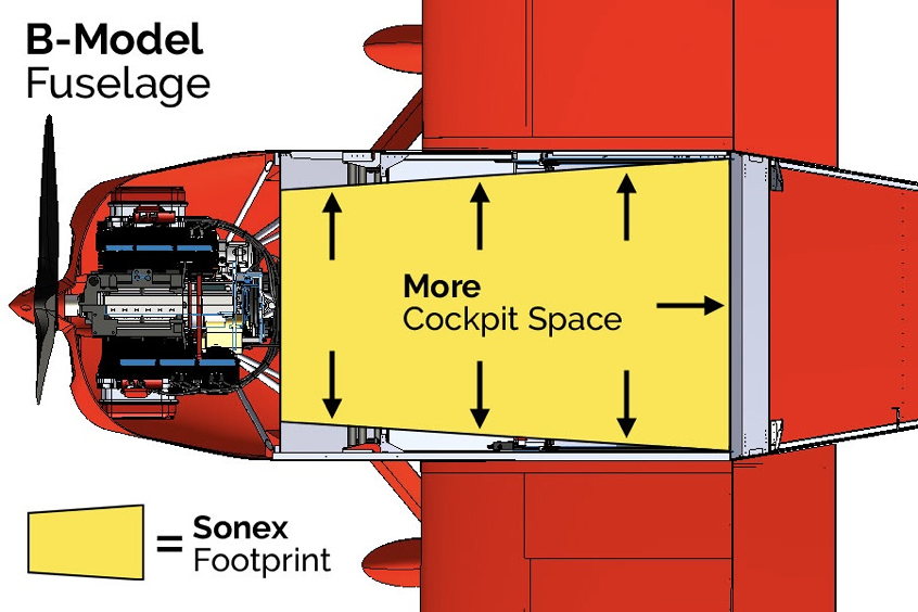 Sonex and Waiex B-Models have been enlarged by straightening of the forward fuselage sides, and feature improved creature comforts: