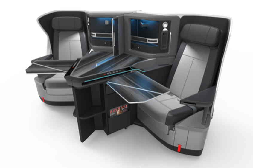 With the Venture line, seats are configured so that every passenger has direct aisle access, fully lie-flat seats, and seamless surroundings including minimal trim due to the trim less patented tencate panel backshell. Additional features include a capacitive touch PCU with customizable LED colors and button icons, customizable mood lighting, elegant leather upholstery, adjustable meal tray, and an 18.5-inch entertainment screen that is mounted such that the passenger can watch in-flight entertainment from gate-to-gate. In addition, Venture's thoughtful design minimizes weight at approximately 85 kg per pax; substantially lighter than comparable models.