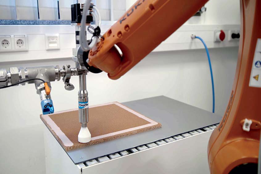Here we take a look at potting materials: These are epoxy resins that are used, for example, to fill in sandwich structures. They are intended to provide stability and stiffness with the least possible increase in weight. The constituent chemicals and components that enable the materials to meet performance characteristics also produce a material that is highly viscous (pasty) and favourable for manual process application. It is precisely this property that makes automation difficult nowadays. The more viscous a material is, the more difficult it is to process automatically