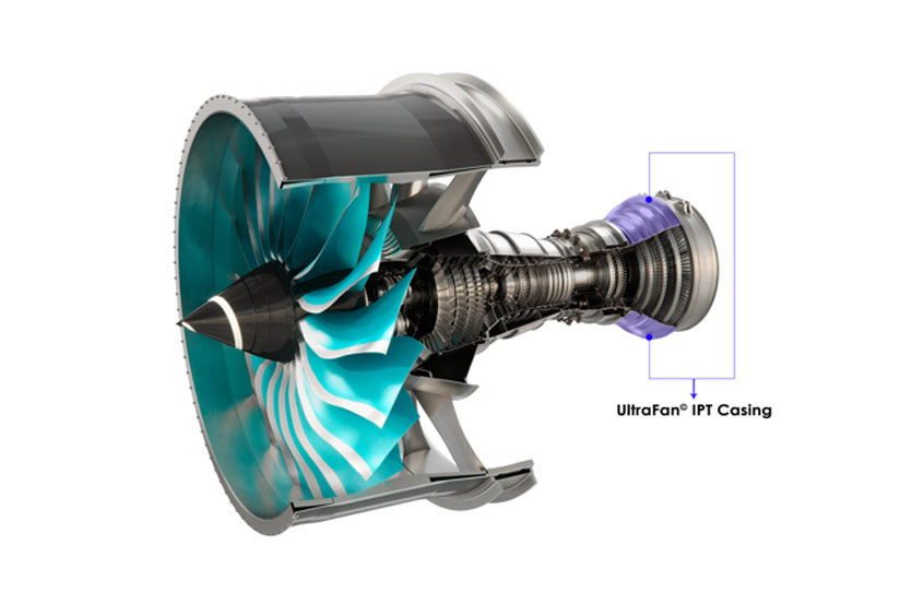 The casing, which covers the IPT of UltraFan, houses the turbine blades and connects the IPT to the rest of the engine. The IPT is a key module of UltraFan, designed to operate at very high speeds to optimize the engine's fuel consumption and minimize CO2 emissions.