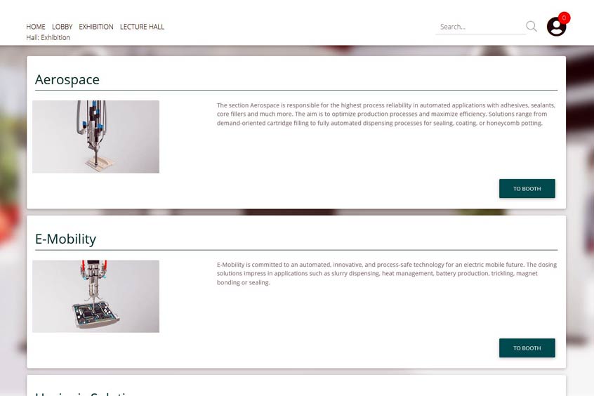 The virtual program of the Dispensing Expo 2020 is diverse: accompanying the exhibition, which is "open" day and night, there is the possibility to communicate with the dispensing technology experts at any time via live chat. This ensures that visitors from all countries and time zones all over the world can get in contact around the clock. Product innovations will be presented as live exhibits and an online trade congress will feature interesting presentations on current topics from the world of dispensing technology. In addition, visitors will have the opportunity to watch application videos and thus gain many interesting insights into dosing solutions of all kinds.