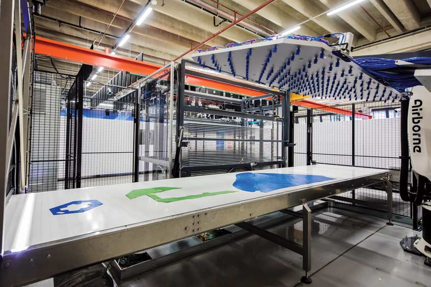 The integration ensures seamless data exchanges between the two systems as plies are unloaded from the cutting table and then automatically sorted into ordered kits by the Airborne's kitting system. As the operator loads each ply to the kitting machine it is scanned and its shape identified, along with its stacking order. The robot sorts, sequences and stacks all subsequent plies until the kit is complete, automatically updating its status within CrossTrack without any user input. When the completed kit leaves the buffer its location status is updated, completely automating the process from cutting through to moving onto layup.