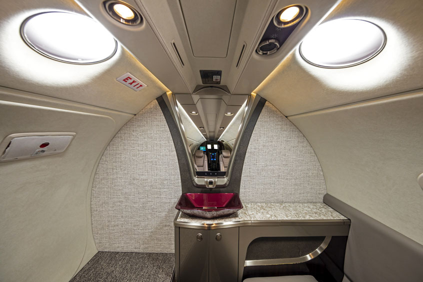 In the jet's main cabin area, side-facing seat selections include a folding single seat, a fixed two-place couch and a folding two-place couch which provide additional storage capacity to secure belongings in flight.