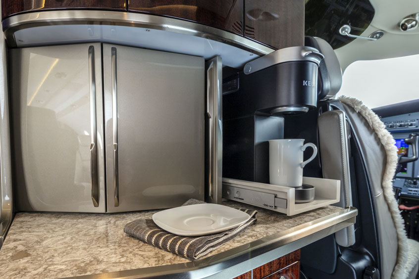 Upon entering the CJ4 Gen2, customers and pilots will notice redesigned stairs with a lower point of entry, handrail support and a customizable logo light. The refreshment center and galley area are comprised of improved storage options and an optional high-power outlet accompanied by a pull-out surface for a coffee maker. Additionally, extendable stone countertops are also available.