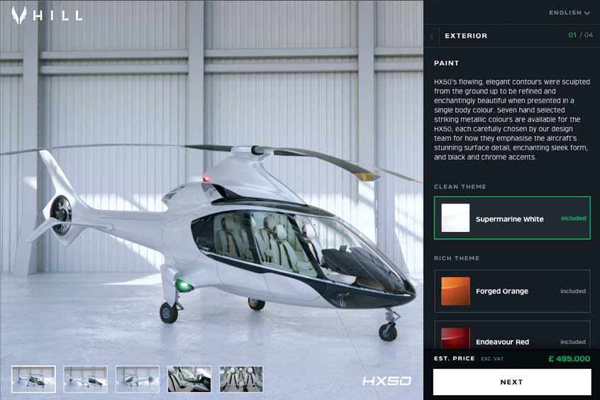 Hill Helicopters unveiled an advanced online aircraft configurator tool for the reimagined HX50 luxury turbine private helicopter. The configurator allows discerning customers to fully visualise their personalised aircraft, choosing customisations from paint colour and finish to options supporting a variety of operations and environments.