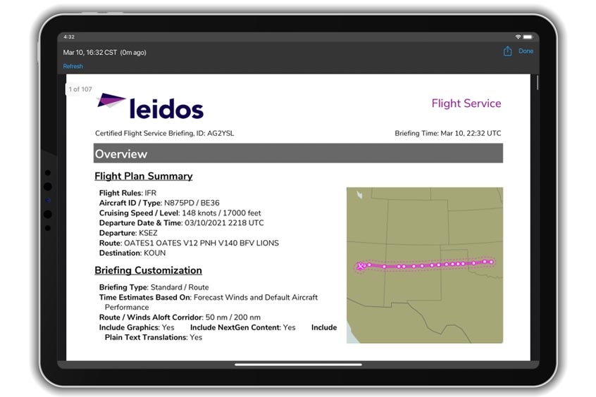 Pilots in the United States and Canada may now access the industry standard Leidos graphical weather briefings within the Garmin Pilot app, providing advanced and up-to-date information before a flight. This next generation weather briefing contains aeronautic information and meteorological data similar to what is provided by a specialist at 1-800-WX-BRIEF, including adverse weather conditions, forecast weather, and more in a printable PDF format.