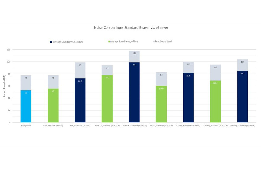 When compared to the standard Beaver aircraft, the eBeaver recorded noise decreases ranging from 16-22 dBA across all phases of flight. Specifically, at take-off phase, the eBeaver recorded noise levels of 20.8 dBA lower on average and 24 dBA lower at peak compared to the standard Beaver, meaning noise energy is at least 100 times lower.