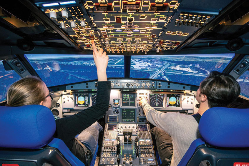 During the virtual first flight in the DLR Air Vehicle Simulator (AVES), DLR test pilots evaluated the flight characteristics of the hybrid electric short-haul aircraft. Particularly during the landing approach, it became apparent that the aerodynamic interaction between the propeller wakes and the wings strongly influences the flight characteristics of the aircraft. To compensate for the reduced effectiveness of the smaller rudder and vertical stabiliser, a research team from the Institute of Flight Systems developed a flight controller that enables yaw control – rotation about the vertical axis – using the rudder combined with differential thrust.