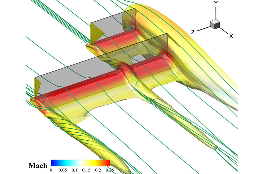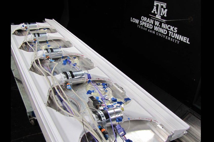 Once airborne, the flaps are rotated to align flush with the wings to provide smooth cruise flight. Figure 2 shows the tandem wing tailless eV/STOL vehicle at cruise. The figure is a simulated Mach contour plot from a NSF funded project using the company's high order scheme CFD (computational fluid dynamics) software. Figure 3 shows the micro-compressors embedded inside a CFJ wing that was recently tested in a DARPA funded wind tunnel experiment.