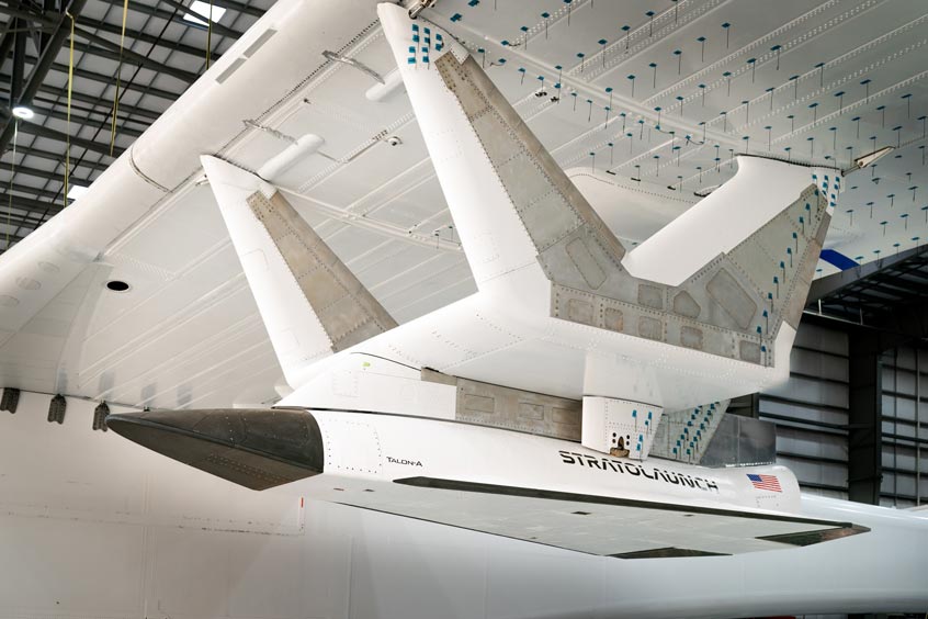The pylon, which was introduced during Roc's fifth test flight on May 4, will be used to carry and release Talon-A hypersonic vehicles. The hardware is comprised of a mini-wing and adapter that is constructed with aluminum and carbon fiber skins. It weighs approximately 8,000 pounds and occupies 14 feet of Roc's 95-foot center wingspan, allowing for adequate space between the aircraft's dual fuselages for safe vehicle release and launch. The custom structure also features a winch system that will load Talon-A vehicles onto the platform from the ground, expediting launch preparation and reducing the need for ground support.