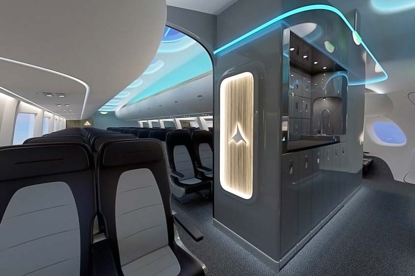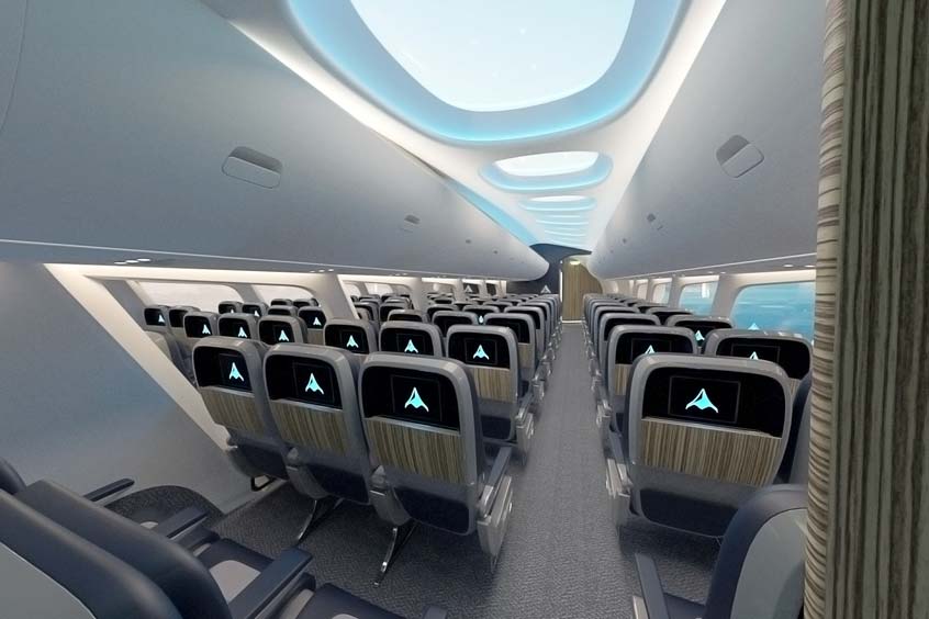 The Ascent™ business jet variant uses BWB efficiency gains to triple the passenger cabin's floor-space when compared to today's top business jets like the Gulfstream G650 and Bombardier Global 7000. “The Ascent™ business jet is not a hallway, it's a home,” says Mr. Page. “This leap in business jet comfort is achieved while preserving the small footprint that allows it to service destinations unavailable to much larger tube-and-wing airliners.” DZYNE showed interior renderings with multiple bedrooms, stand-up showers, a living room, dining areas, a theater, and an exercise room. A unique feature is the large skylights which fill the cabins with natural light and offer an extraordinary view of the stars at night.