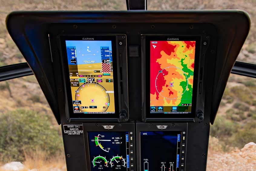 The slimline cockpit is now standard in all new MD500E aircraft and includes four inches of additional visibility on both sides of the instrument panel when compared to the traditional configuration. The modernized design features the Garmin G500H TXiTM dual touch-screen integrated display system with screens serving as Primary Flight Display (PFD) and Multi-Function Display (MFD). Helicopter Synthetic Vision Technology (HSVTTM) and Helicopter Terrain Awareness and Warning System (HTAWS) capabilities are also available via the Garmin G500H TXiTM. Dual Howell Instruments displays serve as the Engine Indicating and Crew Alerting System (EICAS), while the liquid crystal display Garmin GTNTM 650H provides navigation and communication functions, while also including moving map for airway and approach procedures.