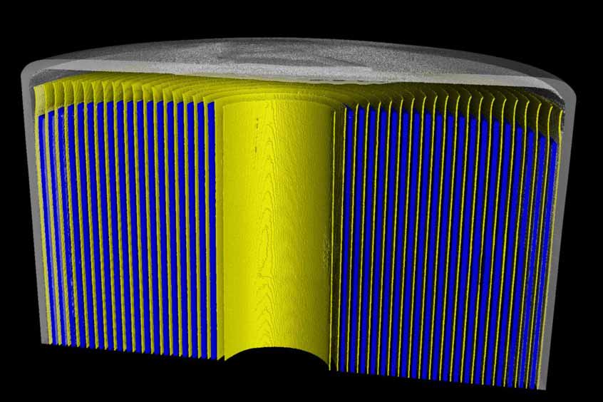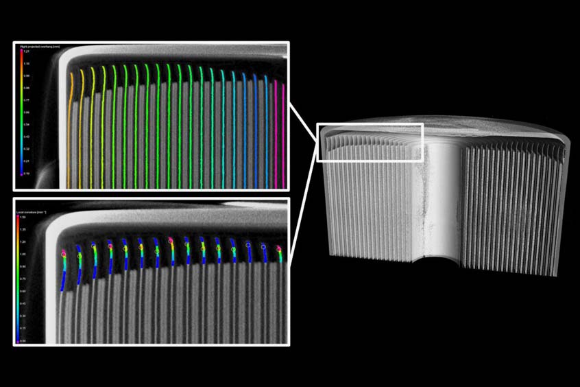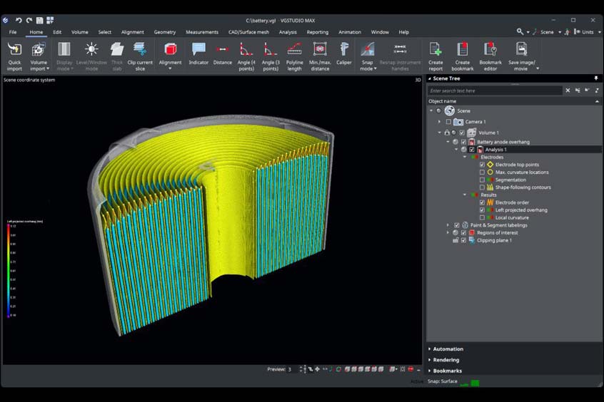 Enhanced Battery Inspection for 2D Anode Overhang Analysis. The software's new battery inspection feature provides dedicated functionality for easy measurement and visualization of battery properties. It provides improved 2D tolerance checking of anode overhang, curvature, thickness and anode exit angle, along with the ability to track shape-following lengths and adjacent electrode counts. Imprecise anode overhang can cause thermal runaway and severe failures, along with limiting electrical performance. The insights that CT-data analysis provides allows research institutions and battery manufacturers to measure voids and particle sizes during the research and development phase, detect delamination and contamination during cell manufacturing, analyze electrical connections and electrolyte fill levels, and provide many other quality-assurance functions that were once impractical or even impossible to perform.