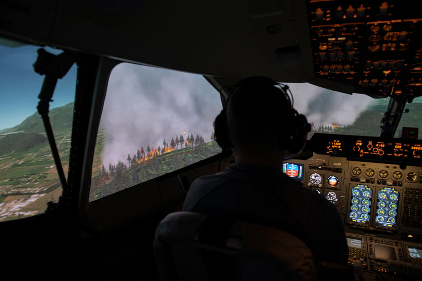 Using Conair's subject matter expertise in aerial firefighting, along with their proprietary wildfire simulation software, Presagis created immersive environments producing visually accurate representations, including smoke and fire accurately representing the wildfire scenario. In addition, Conair's MTS includes highly detailed cockpits with closely replicated functionalities providing the same look and operational feel as aerial firefighting aircraft.
