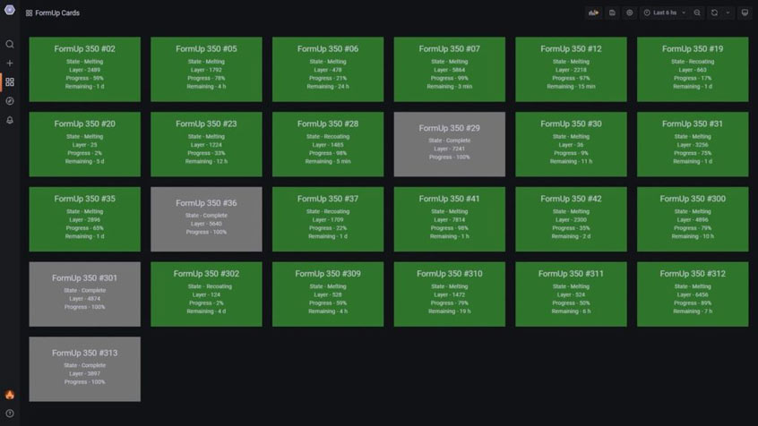 AddUp Dashboards collects and displays data for an unlimited number of FormUp and BeAM machines regardless of their physical location and displays a summary on an overview home screen. This provides a birds-eye view of a full production fleet of machines, offering status and progress at a glance. Users can see the big picture for the last month or check what happened during last layering cycle for a particular build.
