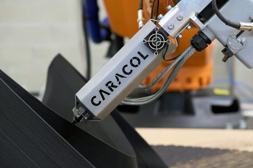 Having developed its own large-scale additive manufacturing robotic system, with a patented thermoplastic pellet extrusion head and proprietary algorithms, Caracol machines produce parts with complex geometries and enhanced mechanical performance thanks to the use of a wide variety of composite and recycled materials. This solution reduces production costs and lead times, minimizes waste and even reuses materials.