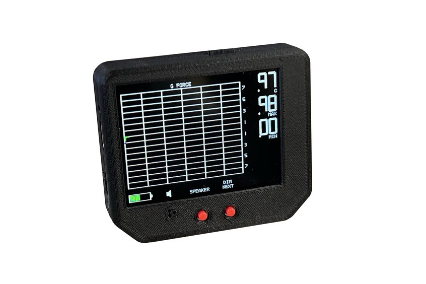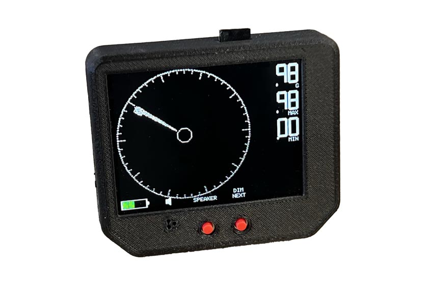Usage is very simple. Mount on a vertical surface. Turn on; the unit will display current, minimum and maximum Gs. Pressing the “next” button switches between graphing mode and needle mode. The needle and the graphing mode are color-coded and will change to red at +4 or -2 G's. An aural alarm also sounds, which may be muted by briefly pressing the speaker button.