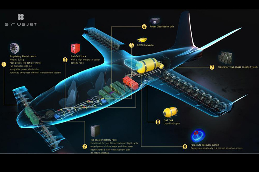 - Innovative Hydrogen-Powered Aircraft: The SiriusJet is a clean-sheet eVTOL design that uses a hydrogen-electric power train to drive 28 300 mm 1 kN electric engines. The hydrogen-electric system draws in oxygen through an intake in the nose of the aircraft, which reacts with hydrogen that is stored a fuselage tank. The reaction produces electricity to power the motors and water, which is disposed of through the aircraft exhaust at the tail. There are no carbon emissions. Performance projections show a cruise altitude of 30,000 feet at a speed of 280 knots, producing less than 60 db of noise.