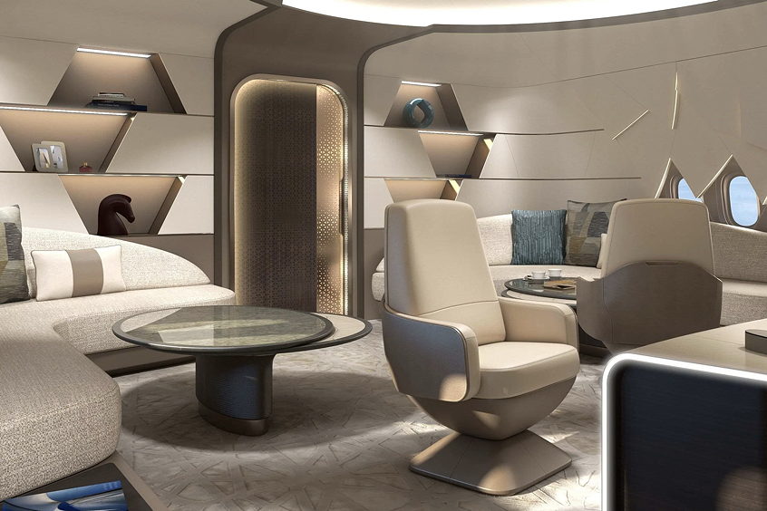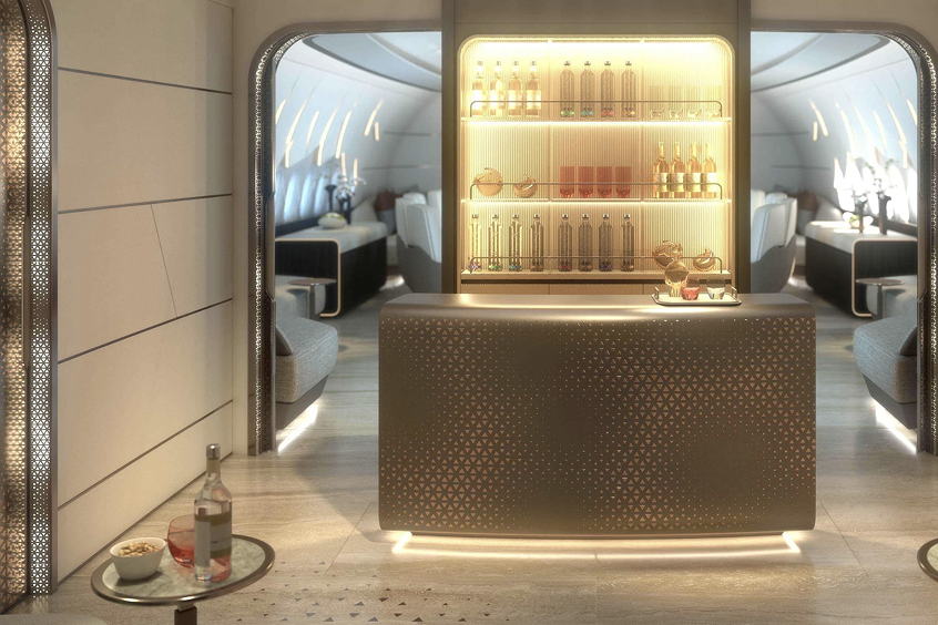 The CelestialSTAR VIP design for the BBJ 777-9 prioritizes versatility and multifunctionality. It showcases an impressive array of stunning features and furthermore maximizes space, comfort, and incorporates traditional elements of Middle Eastern cultural heritage with a modern twist. A special light and window shade concept has been implemented throughout the cabin, giving passengers the feeling of being in their personal living room rather than on a plane at 30,000 ft, particularly important for an ultra-long range aircraft.