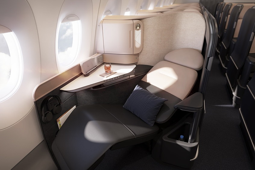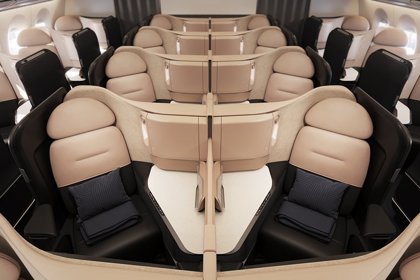 There are preconfigured stowages with both open and closed storage options, a large bi-fold table and a customisable console area. The centre seat-pairs feature a full-width privacy screen. Wireless charging and a wide range of outlet options are provided, along with in-suite mood lighting and IFE monitors up to 24”.