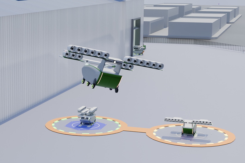 The “e350 Flying Cargo Van” is an electric, fully autonomous VTOL (vertical take-off and landing) drone capable of transporting one pallet of up to 350kg over 200 km fully electric, or 600 km hybrid hydrogen-electric at a speed of 220km/h, delivering goods over 100km in just under 30 minutes. What sets the e350 apart is its ability to transition from flying to driving by folding its wings, allowing for efficient last-mile ground navigation. The e350 autonomously lands vertically, drives to the final destination, enters warehouses or factories, and handles automated loading, unloading, and charging of its specialized Cargo Containers via a Charging and Loading Station (CLS) — all without human intervention.