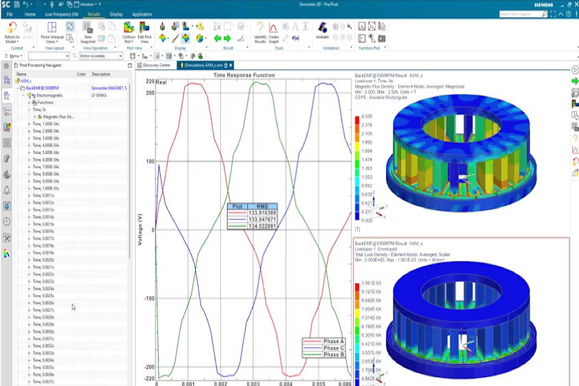 - Axial flux motor simulation: Simcenter enables faster design and simulation of compact, high-power-density motors. Engineers can quickly create lightweight designs using Siemens’ Simcenter E-Machine Design software, then transition seamlessly to 3D simulations in Siemens’ Simcenter 3D software for comprehensive electromagnetic, thermal and mechanical performance assessments.