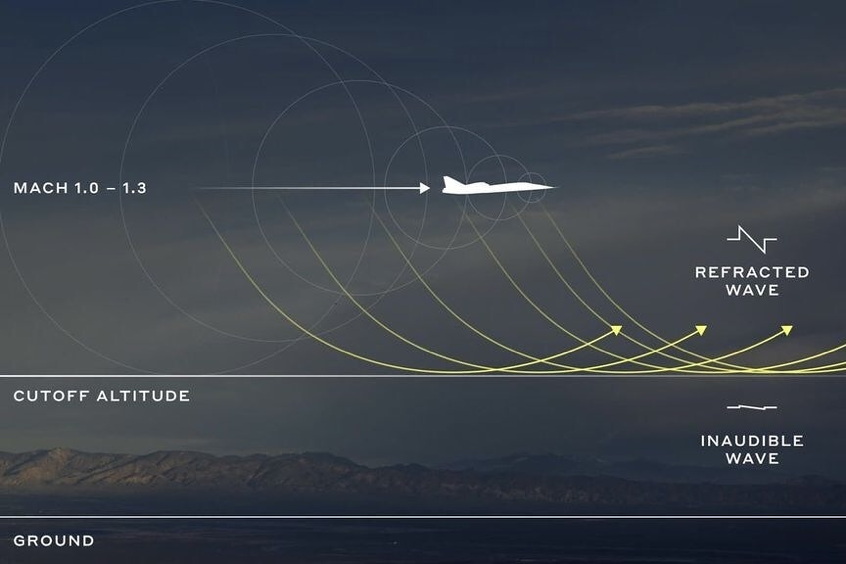 Boomless Cruise is based on well-established physics known as Mach cutoff, in which a sonic boom refracts in the atmosphere and never reaches the ground. This effect is achieved by breaking the sound barrier at a high enough altitude, with exact speeds varying based on atmospheric conditions.