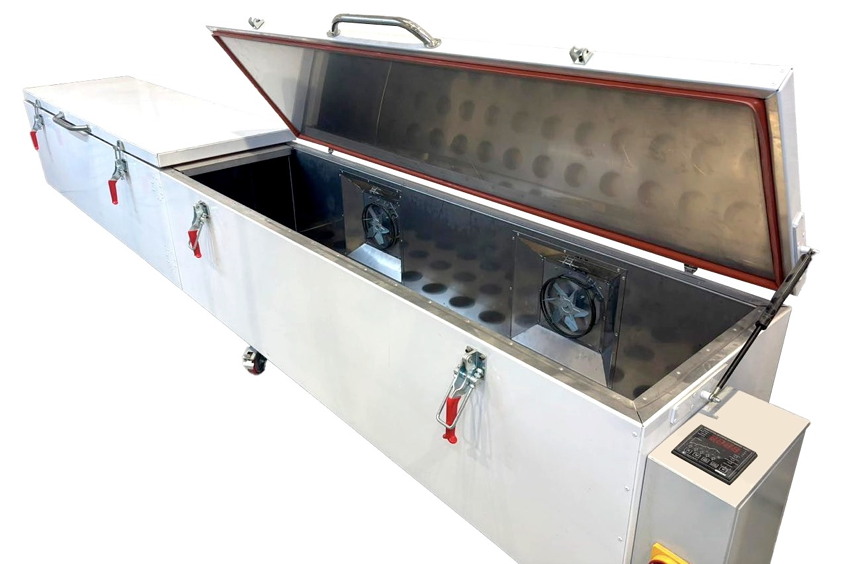 This top-loaded Oven-700-4000 will be used for composite curing parts and has a maximum oven operating temperature of 200°C. The work chamber dimensions of this oven are 700 mm wide x 4000 mm long x 700 mm high. Guaranteed temperature uniformity is ±5°C at set point 200°C.
