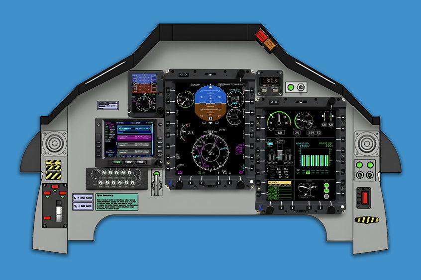Astronautics’ Badger Pro+ Gen 2.0 smart 6” x 8” multifunction displays (MFDs) are at the core of the avionics system with two displays in the front cockpit and two in the aft cockpit. The displays will provide pilots with primary flight display (PFD), engine indicating and crew alerting system (EICAS), and a video page to assist the instructor in monitoring student pilot operation. Adjacent to the MFDs will be Avidyne’s top of the line IFD550 integrated FMS/GPS/NAV/COM with synthetic vision capability. Both the Badger Pro+ and the IFD550 are night vision compatible. The cockpit displays and FMS integrate information from the other subsystems creating the total system solution.