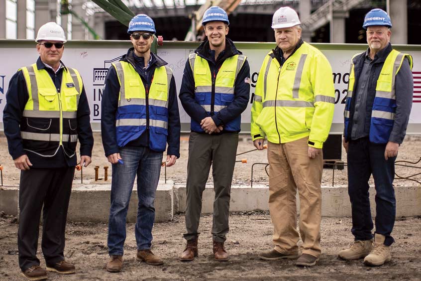 The event brought together representatives from Equity Industrial Partners, Quonset Development Corporation, Integrated Builders, Vision 3 Architects, Zaino & Associates, the REGENT crew, and the team of builders who have worked to bring the facility to life. In keeping with building tradition, the attendees signed the beam before it was lifted into place, symbolizing the collaboration and craftsmanship behind the project.