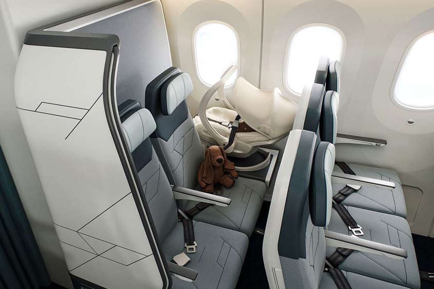 The suite includes a deployable privacy divider, dampening cabin noise and providing a visual barrier from the aisle, lavatory queues and galley traffic. Users are afforded extra seclusion to feed and soothe young children, minimize disruptions to fellow passengers, or simply relax in a more peaceful retreat.