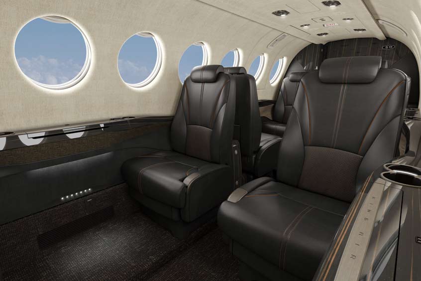 A redesigned bespoke cabin design features a stunning new look with custom-built cabinetry, partitions and side ledges, upgraded materials and finishes, along with all new interior schemes. Other amenities that come standard on the entire King Air lineup include pull-out work tables, standard power outlets, USB charging stations and a private aft lavatory.