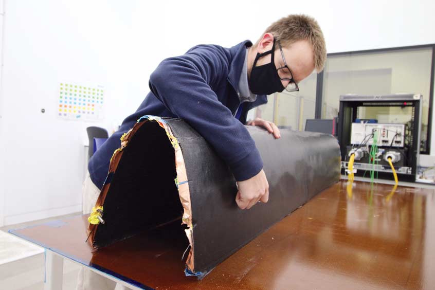 “Linked to both these technologies is self-sensing, monitoring the electrical resistance of the part to detect damage. When you get barely visible impact damage (BVID), the resistance changes so you can monitor that and detect where the damage is. BVID is something the aerospace industry is very interested in because it is very difficult to detect through visual inspection, which they currently do, on composite structures.”