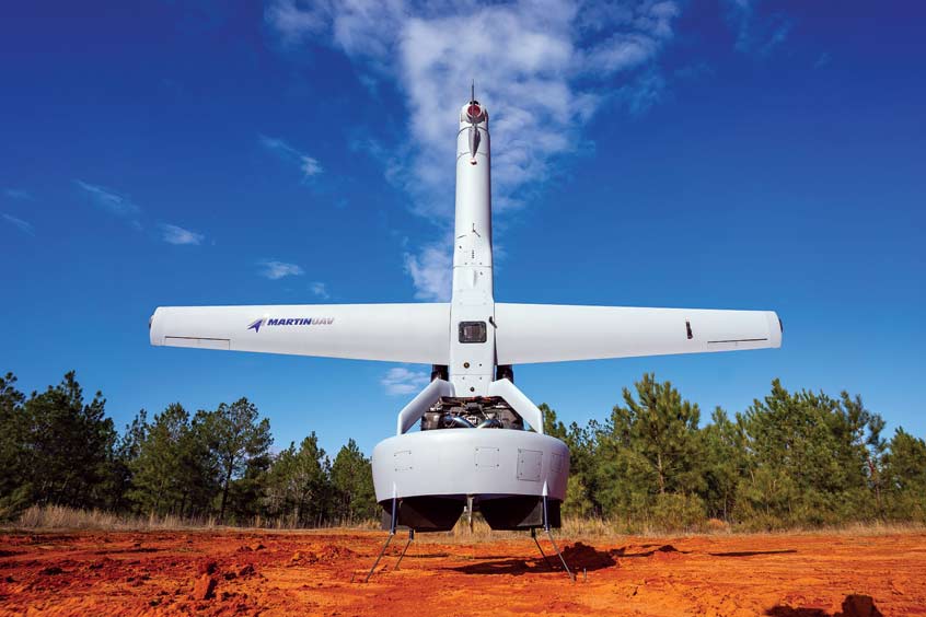 V-BAT 128 is ideal for takeoff and landing on both stationary and moving platforms, in areas with a footprint of less than 12 feet-by-12 feet. Among the improvements made by Martin UAV are enhancements to the engine, a remote-start 288cc 2-stroke EFI, increased horsepower, 11-plus hours of endurance, and up to 25 pounds of interchangeable payloads for mission-specific requirements. With a wingspan of 9.7 feet, the V-BAT 128 can reach 90+ knots reaching altitudes of 20,000 feet.
