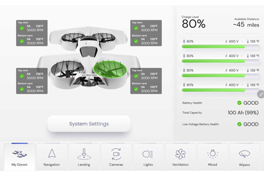 The H1's onboard dash system makes use of touchscreen monitors to control all aspects of flight and user experience, including: navigation, landing, cameras, lights, ventilation, mood lighting and wipes. In addition to the dual control sticks, which mirror each other for left or right-handed use, the dash system also includes peripherals such as an engine start button, left and right buttons to control doors, as well as RFID sensors. Using this system, users will hear audibles like “Doroni Systems Check” and “Doroni Ready for Takeoff” from the vehicle's onboard computer.