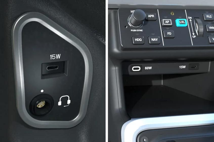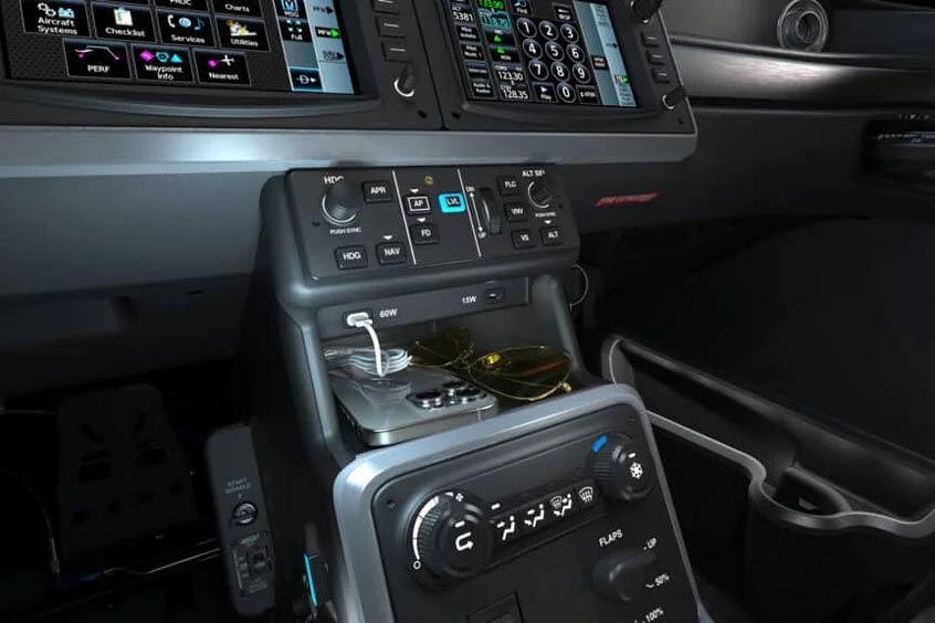 The reimagined interior embodies auto-inspired features and ergonomics throughout featuring: New Push Button Start modernizes the G7 aircraft ignition; Automatic Fuel Selector System makes fuel management even easier by automatically switching between fuel tanks every five gallons; redesigned interior panels incorporate dimmable task lights and ambient accent lighting, illuminating the cabin; sturdy cup holders, numerous pockets and two center console compartments neatly store belongings for increased organization, seamless cord management and accessibility; and Powered Headset Jacks and Lighted High-Power USB-C outlets within easy reach of each occupant.