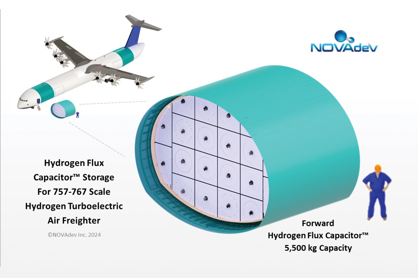 “What we are developing truly addresses aviation's biggest issues with hydrogen which are volume, weight, cost and safety,” explains Michael Kramer, NOVAdev founder and CEO. “Our Hydrogen Flux Capacitor requires only low-cost, commercial off-the-shelf materials and readily scales for large or small aircraft. It truly enables hydrogen's efficient integration into aviation in ways that other systems cannot and offers outstanding safety benefits. We store hydrogen as a compact solid at low pressure. That is as transformative for hydrogen as LEDs for lighting.”